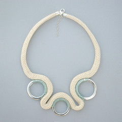 Inspired by the colours and architecture found by the seafront in her home city of Brighton, London-based jewelry designer Eleanor Bolton has designed a limited edition of ten necklaces exclusively for Lin Morris. The Brighton necklace is made from cotton braid and silver plated brass rings that are sewn together with pier green Rowan yarn. The fastening and catch are sterling silver, and it comes with a 2 inch extender chain.